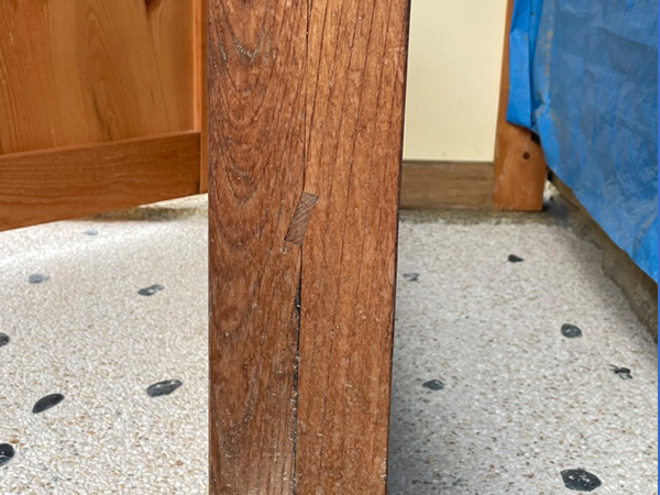 垂木とは小屋組の一部で、屋根の一番高い棟木から桁にかけて、斜めに取り付けられる棒状の木材です。屋根の下地になる野地板を固定する部材で、傷んでいる場合は「抱かせ」といって添え木での補強や交換を行います。屋根の下地を支える部材のため、しっかりと固定・補強を行います。